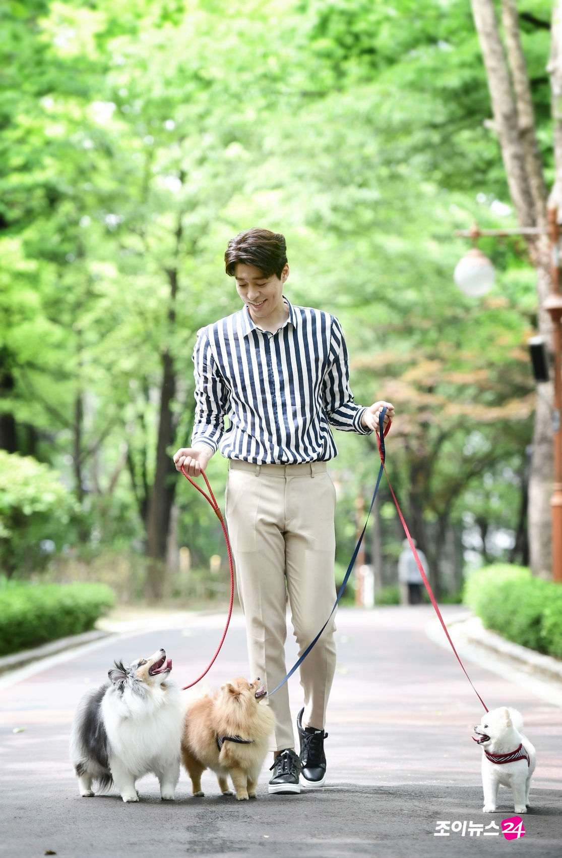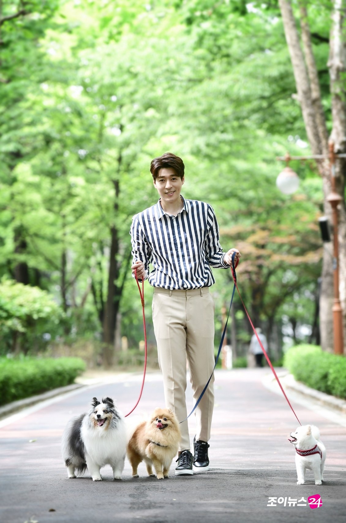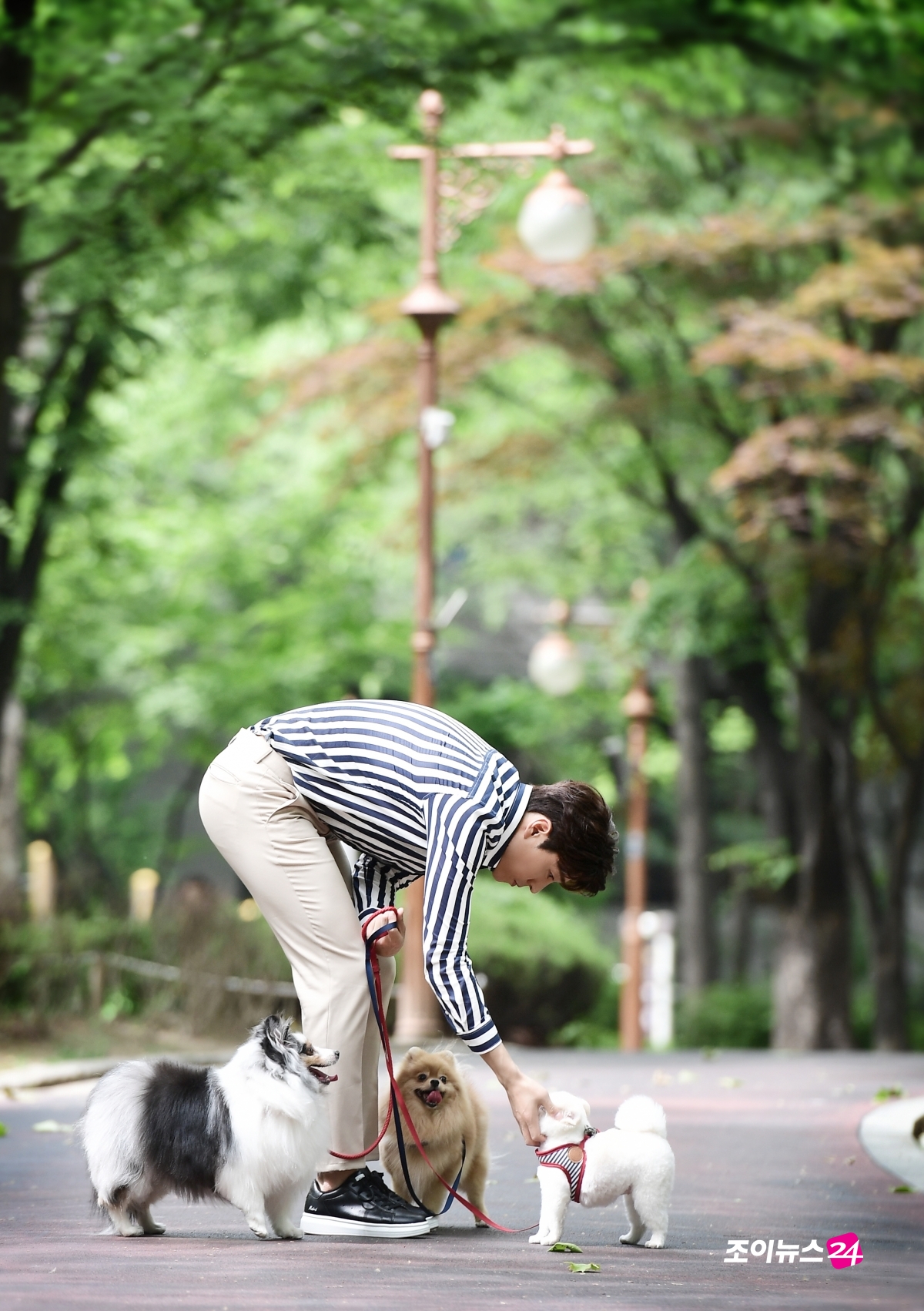 28도를 웃도는 무더운 날씨, 서울 청담동 도산공원에서 만난 서지석은 사진 촬영 전 이미 반려견 세 마리를 이끌고 한바퀴 산책을 마쳤다. 본격적으로 촬영이 시작되자 서지석은 제각각인 세 마리를 어르고 달래느라 분주하다. "웃어달라"는 주문에 "웃음이 안 나온다"고 장난스럽게 말하면서도 반려견들을 따뜻한 손길로 어루만진다. 생김새만큼 성격도 다른 반려견들의 특성을 하나하나 소개하기도 하고, 얼마 전 다리 수술을 마친 아이스를 걱정스럽게 바라보기도 했다. '엄격하지만 따뜻한' 아빠 서지석의 마음이 고스란히 느껴졌다.