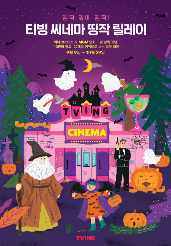 티빙 씨네마는 새로운 기획전 띵작 릴레이의 시작을 알리며 공식 포스터와 예고편도 함께 공개했다. 지난 아트무비 콜렉션에 이어 이번에도 감성 일러스트 작가 애슝(AE SHOONG)과 콜라보레이션한 띵작 릴레이 포스터는 다가오는 가을의 정취를 담은 보랏빛의 할로윈 분위기를 담아냈다. 특히 워너브러더스와 MGM 작품에 등장하는 요소들이 포스터 곳곳에 녹아있어 깨알 같은 재미를 선사해 벌써부터 팬들의 반응이 뜨겁다. 함께 공개한 예고편 역시 더욱 풍부해진 라인업을 알리며 티빙 씨네마에서 만날 다양한 재미에 대한 기대감을 높인다.