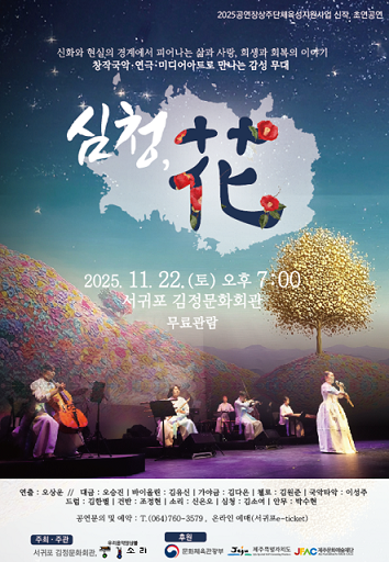 서귀포시 관계자는 “'심청, 花'는 한국 설화와 제주 신화를 결합한 독창적 스토리와 전통예술의 감성이 어우러진 무대로 시민들에게 깊은 위로와 감동을 전할 것”이라며 “앞으로도 김정문화회관을 통해 지역 예술의 창작 기반을 확대해 나가겠다”라고 밝혔다.