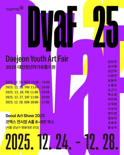 제3차 대전유스아트페어 24~28일 개최대전문화재단은 ‘2025년 3차 대전유스아트페어를 24일부터 28일까지 코엑스전시장 A홀에서 열리는 2025 서울아트쇼와 결합해 개최한다. 대전유스아트페어는 대전지역 청년작가의 미술작품을 전시·유통·판매하기 위한 사업이다. 이번 3차 아트페어에는 202⋯