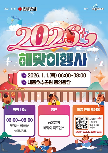 세종호수공원서 丙午年 해맞이 행사 개최2026년 1월 1일 세종호수공원에서 병오년(丙午年) 해맞이 행사가 열린다. 이번 해맞이 행사는 대한적십자사봉사회 세종시지구협의회 주관으로 2026년 1월 1일 오전 6시부터 시작한다. 행사는 시민들이 새해 첫 일출을 감상하고 떡국을 먹으면서 희망찬 새해⋯