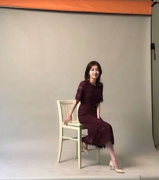 올라온 사진 속 정인선은 촬영 소품으로 준비된 의자에 걸쳐 앉아 있으며 정인선은 자주색 레이스 원피스에 베이지 미들힐을 신고 있다.