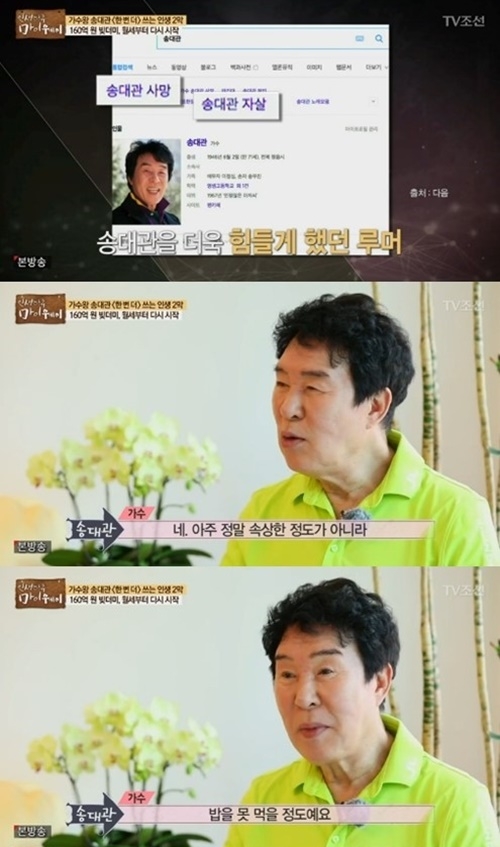 한편, 송대관은 송대관 사망, 송대관 자살이라는 연관검색어에 대해 “아주 속상한 정도가 아니라 밥을 못 먹을 정도다”라고 고백했다.