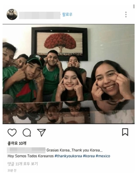 일부 멕시코 축구 팬들은 'Gracias Corea!(고마워 한국!)'이란 해시태그(#)와 함께 동양인 비하를 떠올리게 하는 '찢어진 눈' 제스처를 취한 채 사진을 찍어 올렸다.