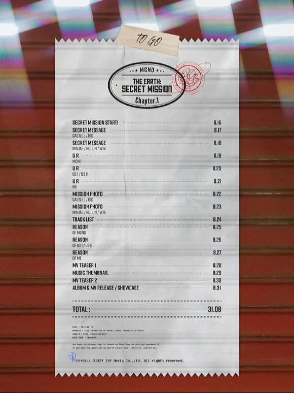 공개된 스케줄러에 따르면 MCND는 8월 31일 'THE EARTH: SECRET MISSION Chapter.1' 음원 전곡과 타이틀곡 뮤직비디오를 전격 공개하고 컴백한다. 이에 앞서 오는 16일 시크릿 미션을 시작으로 단체 및 개인 포토, 트랙리스트, 뮤직비디오 티저, 뮤직 썸네일 등 다양한 콘텐츠를 예고해 글로벌 팬들의 뜨거운 호응을 얻고 있다.
