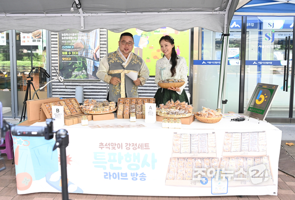 [조이뉴스24 정소희 기자] 산림조합이 추석을 맞아 10일 서울 송파구 산림조합중앙회 앞에서 곡식플러스와 함께 전통 수제 강정 및 가평 잣의 실속선물세트를 저렴한 가격에 판매하는 라이브 쇼핑 행사를 개최했다. 일일 쇼호스트로 나선 개그맨 송영길과 가수 강소리가 제품을 소개하고 있다.