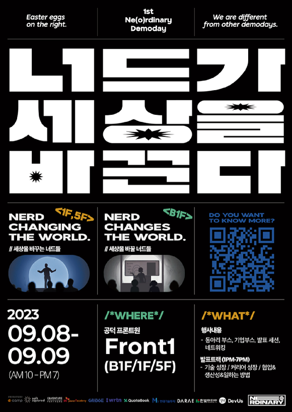 " '너드'가 세상을 바꾼다"라는 슬로건하에 '너디너리 데모데이'는 ▲B1F는 세상을 바꾸고 싶은 'IT 연합 동아리'의 부스, ▲1F는 세상을 바꾸고 있는 'IT 기업'의 부스, ▲5F는 세상을 바꾸고 있는 '사람들'의 컨퍼런스 세션으로 구성된다.