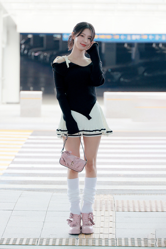 미연은 ‘면프로디테’, ‘여신’이라는 수식어에 걸맞게 레더 소재의 오키드 플라워 장식 디테일이 돋보이는 로즈 컬러의 부츠와 숄더백을 함께 매치해 러블리하면서도 우아한 공항패션을 선보였다.