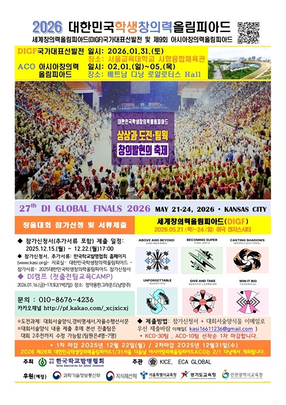 KCO 수상팀은 2026년 5월 21일부터 24일까지 미국 캔자스시티에서 열리는 ‘제27회 세계창의력올림피아드(DI Global Finals, DIGF)’에 대한민국 대표로 서게 된다.