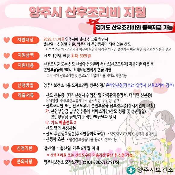 지원 대상은 2025년 1월 1일 이후 양주시에 출생 신고를 하고, 출산일부터 신청일 기준까지 산모가 양주시에 주민등록을 두고 있어야 한다.