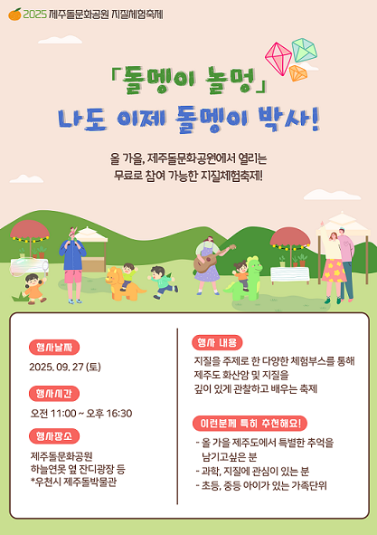 첫날인 27일에는 오전 11시부터 오후 4시 30분까지 '2025 제주돌문화공원 지질체험축제'가 진행된다. ‘돌멩이 놀멍, 나도 이제 돌멩이 박사!’라는 주제로 펼쳐지는 이번 축제는 제주도의 독특한 지질학적 특성을 쉽고 재미있게 체험하며 배울 수 있는 기회를 제공한다.