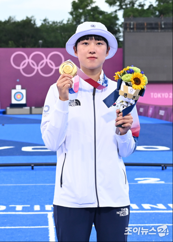 한국 양궁 안산이 일본 도쿄 유메노시마공원 양궁장에서 열린 2020 도쿄올림픽 양궁 여자 개인전 결승에서 ROC(러시아올림픽위원회)의 옐레나 오시포바를 누르고 금메달을 차지했다. 안산이 금메달을 들고 포토타임을 갖고 있다.