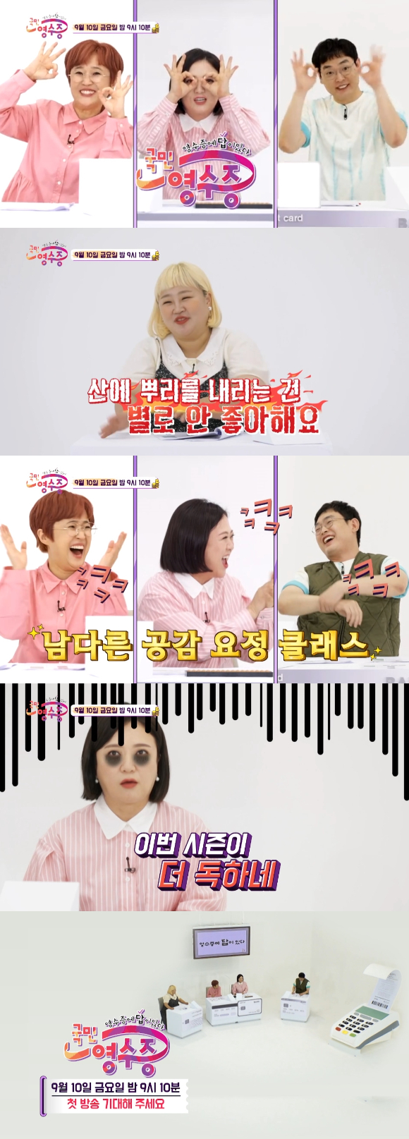 10일 밤 9시 10분 첫 방송되는 KBS Joy 신규 예능 '국민 영수증' 1회에서는 개그우먼 홍윤화의 영수증을 분석하는 3MC 송은이, 김숙, 박영진의 모습이 전파를 탄다.
